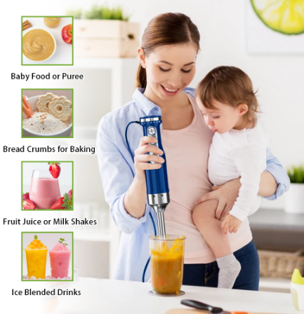 HIGH-EFFICIENCY BLENDER. Thick stainless steel mixing wand with 4-blade system. Make food mixing more efficient, evenly and smoothly.