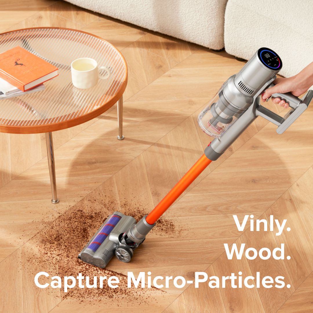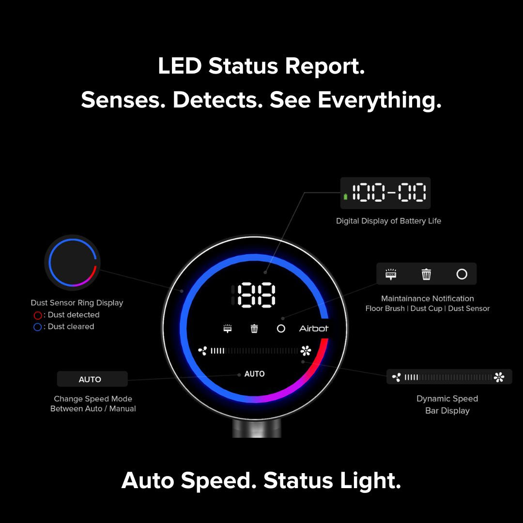 Smart dust sensing in real time, automatically adjust vacuum speed to optimum level for deep cleaning. See speed bar, dust intensity, battery level on LED screen, touch control at finger tips, clean effortlessly