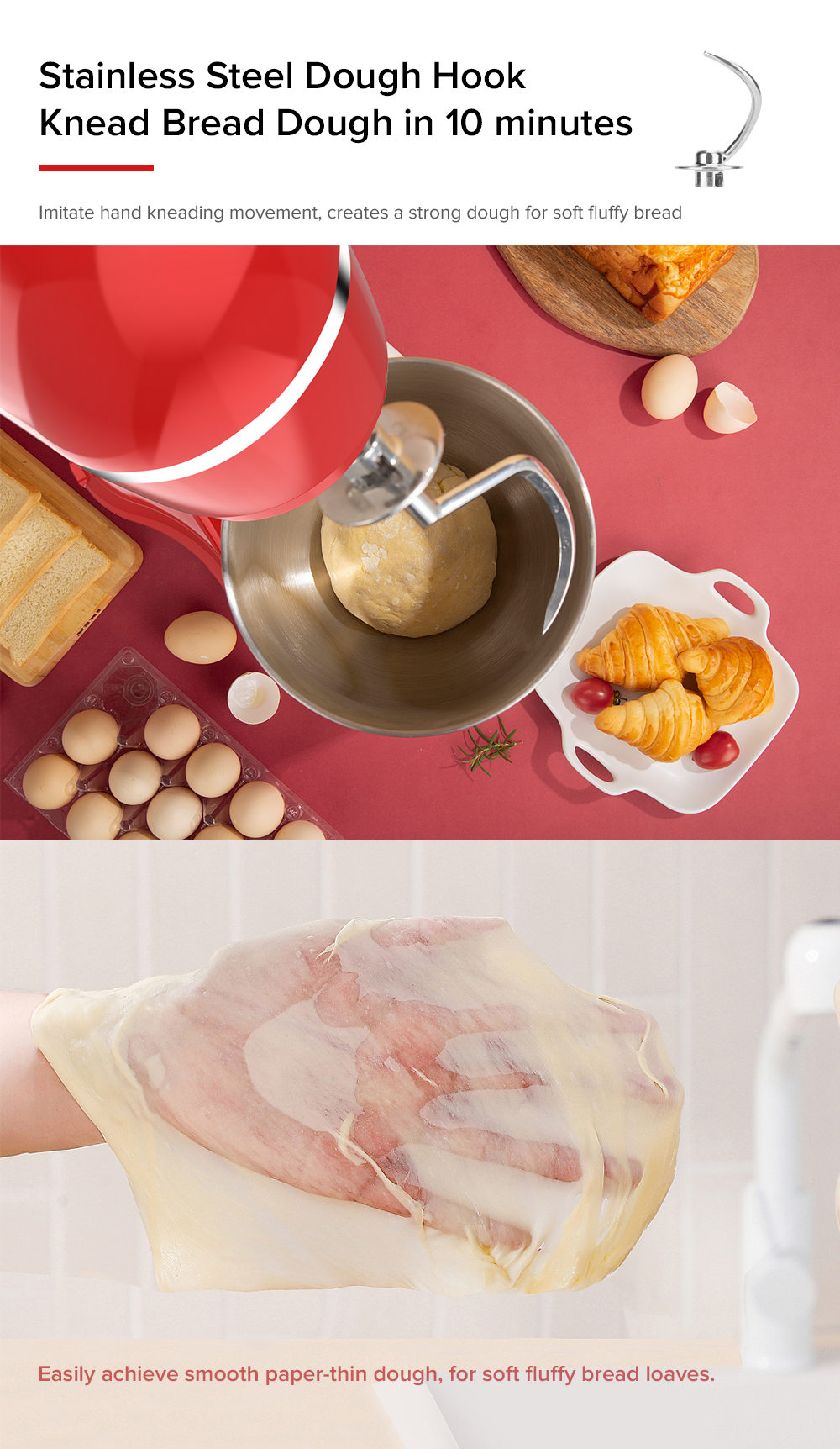 Dough hook, 585g flour + 315g water, speed level 2-3, time 1min to form cluster, to achieve better results, please add 40 +/- 5 ° C water.