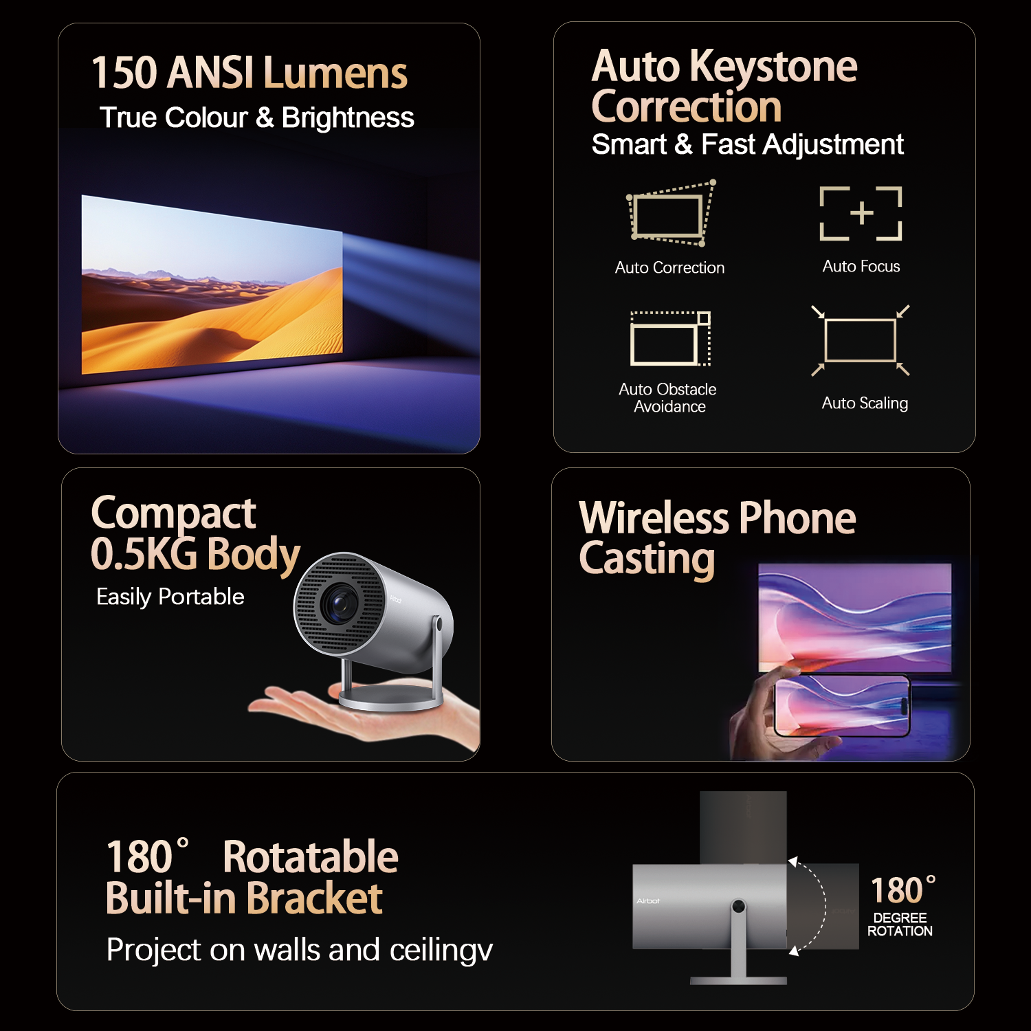 A portable and lightweight 0.5kg projector with Android 11, 1080P 4K support, Wi-Fi 6+BT 5.4, and electric focus/keystone adjustment, ideal for high-quality video playback up to 4K@30fps.
